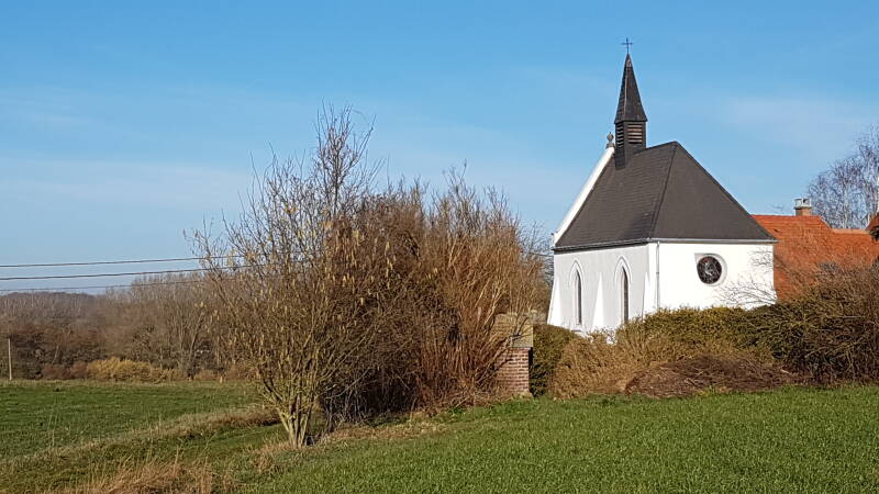 La chapelle Notre-Dame des Belles Pierres vue du sentier des Belles Pierres et son chemin des 7 douleurs situé dans le jardinet à l'arrière de la chapelle.