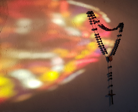 Dans la chapelle Notre-Dame des Belles Pierres, quand le chapelet est éclairé par le soleil levant à travers le vitrail.