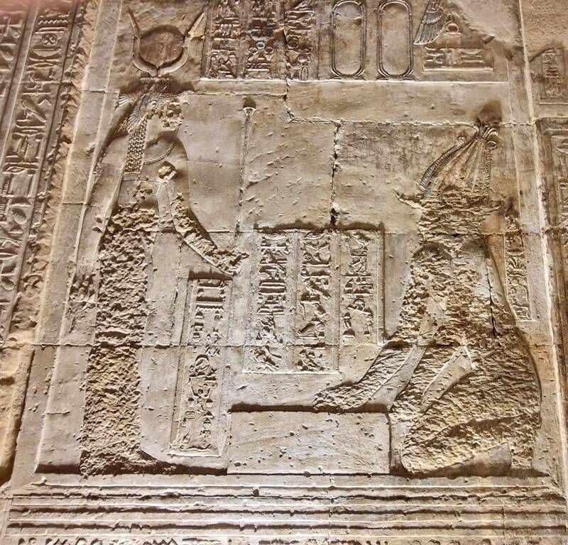 Dendérah est un petit temple - semble-t-il - et souvent ce sont les petites choses qui sont des merveilles : le centre d'une fleur, le diamant au doigt de l'épouse, la bouche de l'aimée. Mais cela n'est que la promesse de bien plus. Denderah est ainsi. Vu de loin, le temple semble petit. Mais passé la porte, il y en a une autre, puis une autre encore et bien d'autres encore : cinq pour arriver au centre du sanctuaire, sans compter toutes celles donnant dans les pièces adjacentes. Chaque porte donne accès à des expressions différentes de l'amour-don. Pour dire vrai, j'ai été subjugué, incrédule devant tant de beauté. A part le sol, pas un centimètre carré ne se trouve sans gravures. Même l'intérieur des bouches d'aération sont sculptées et peintes ... L'amour, l'amour partout. Alors, Hathor, je te laisse la place.