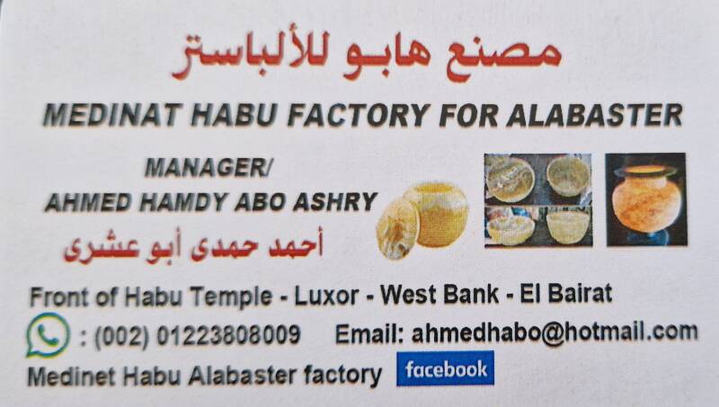 Le magasin est situé en face de l'entrée du temple d'Habu, sur le trottoir de droite de la rue qui arrive au temple quand on tourne le dos à celui-ci. Le Medenit Habu for alabaster se trouve en contre-bas de la route. Cela ne paye pas de mine de la rue, mais cela change bien dès que l'on pousse la porte de la pièce unique où des trésors se cachent. Ahmed est un homme honnête et sensible avec qui il est agréable de prendre un thé.