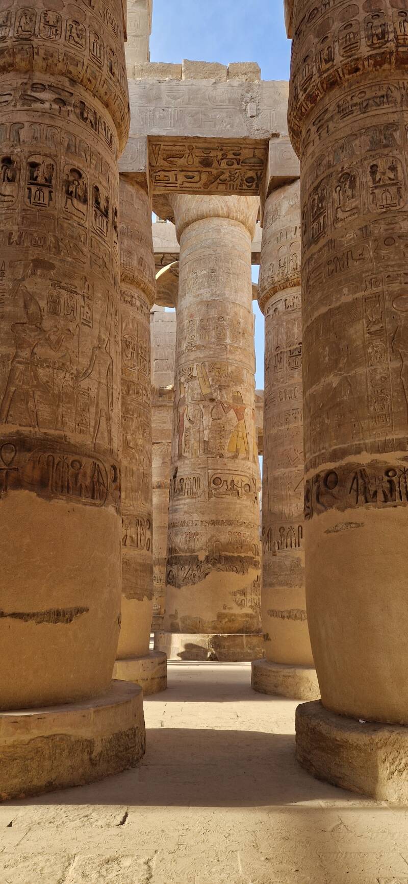 Vous aurez aussi le temps d'observer comme vous le souhaitez l'allée des sphinx à l'entrée et ceux de la première cour. Vous vous sentirez bien petit seul entre les hautes parois des pylônes et, dans la salle hypostyle vous pourrez vous laisser baigner par l'atmosphère des lieux, prendre vote temps pour détailler les reliefs bien différents sur chaque colonne.