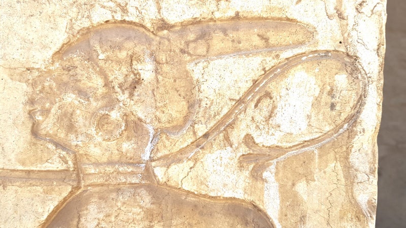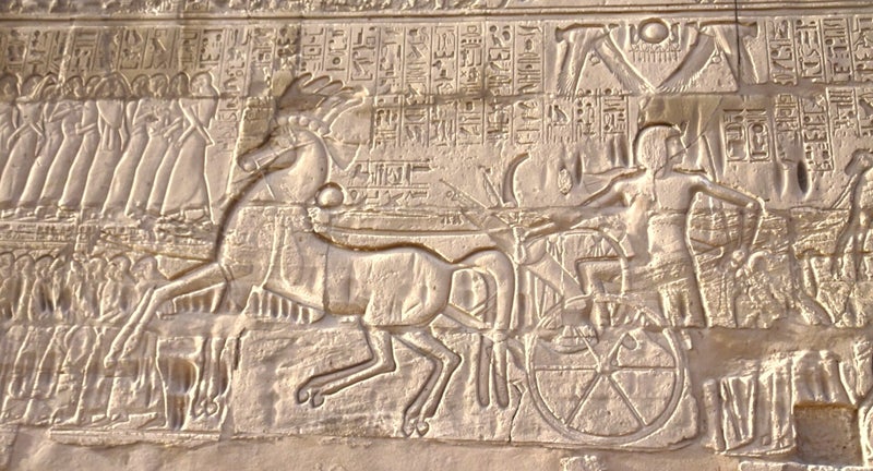 Quand vous serez du côté gauche de la salle, pensez à en sortir pour aller voir les merveilleux reliefs sur son mur extérieur. Prenez le temps de détailler ces scènes de guerre. Voyez comme les chars du souverain étaient tiré par deux chevaux, le deuxième étant suggéré par le doublement des pattes et de la queue.