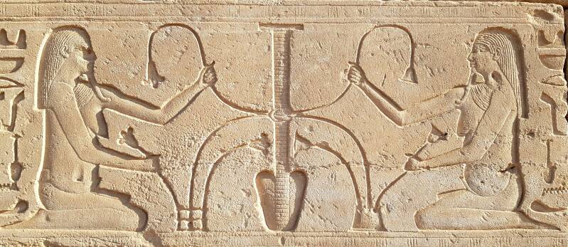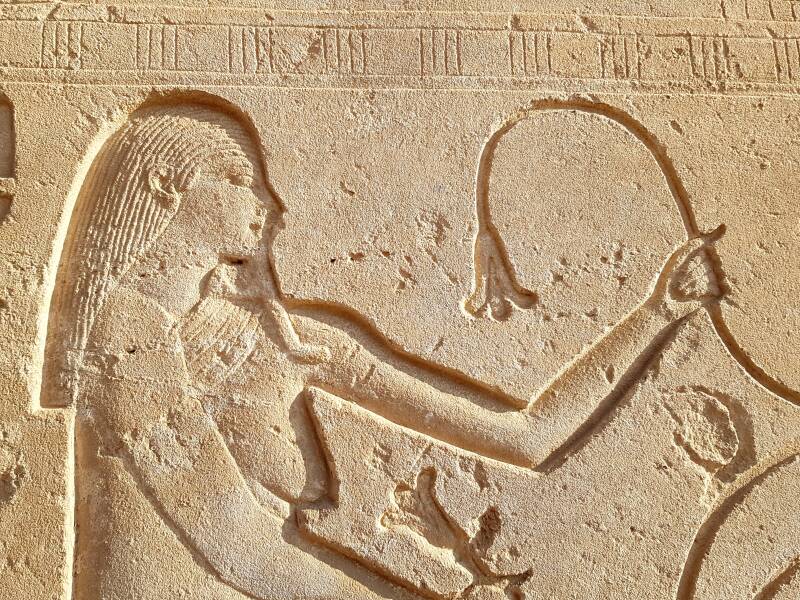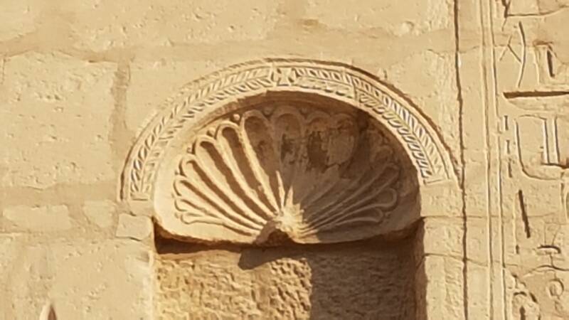 Et, en retournant vers le temple, arrêtez-vous au niveau de la porte majestueuse devant vous. Cherchez cette trace de la chrétienté du côté gauche que l'on retrouve aussi dans l'enceinte du temple de Dendérah, au niveau de la basilique romaine.