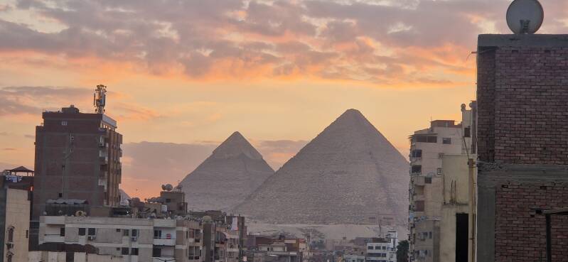 Le Caire - la ville elle-même ne m'a guère laissé de bonnes impressions. Nous logions dans un guesthouse à Gizet afin d'être au plus près des pyramides et du nouveau musée. Oui, les pyramides étaient bien visibles depuis la terrasse sur le toit de l'immeuble (>>>) mais, pour les atteindre, il a fallu 1/2 heure de voiture ... Le Caire, c'est 20 M d'habitants et Gizet, 10 M. ; Le Caire, c'est 8 bandes de circulation dans un sens et 8 dans l'autre sens pour entrer et sortir de la ville. Et, c'est le bruit constant, et, puisque nous étions en période de ramadan, cela durait toute la nuit. Bref, Le Caire, plus pour nous.