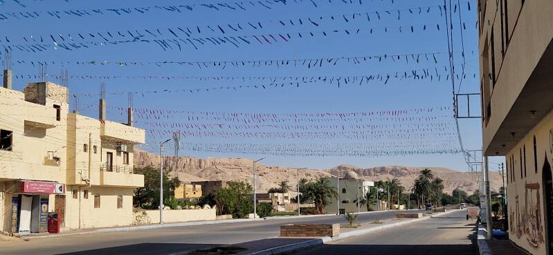 Le décorations pour le ramadan dans la rue principale de Medinet Habu sur fond de la montagne de Thèbes, la montagne des vallées des reines, des artisans, des nobles et des rois ainsi que la nécropole de l'Asasif, la montagne au pied de laquelle se trouvent les temples d'Hatchepsout, de Sethi 1er, d'Habu et le Ramseseum, entre autres.